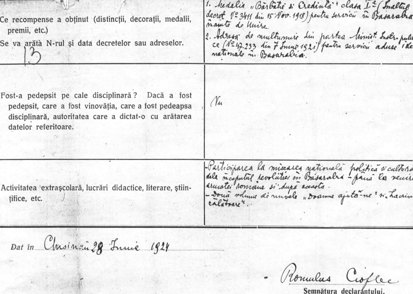 În „Statul personal” de la Liceul de Băieți nr. 2 „Mihai Eminescu” din Chișinău, completat de Romulus Cioflec în 28.06. 1924, la rubrica Activitatea extraşcolară se află scris: „Participarea la mişcarea naţională politică şi culturală de la începutul revoluţiei în Basarabia, până la venirea armatei române şi după aceasta”. La rubrica Ce recompense a obţinut: Medalia „Bărbăţie şi Credinţă”, clasa I (Înaltul Decret nr. 3411/15.11.1918), pentru servicii în Basarabia înainte de Unire şi Adresă de mulţumire din partea Ministerului Instrucţiunii Publice (nr. 47.233 din 7.06.1921), „pentru servicii aduse ideii naţionale în Basarabia”.